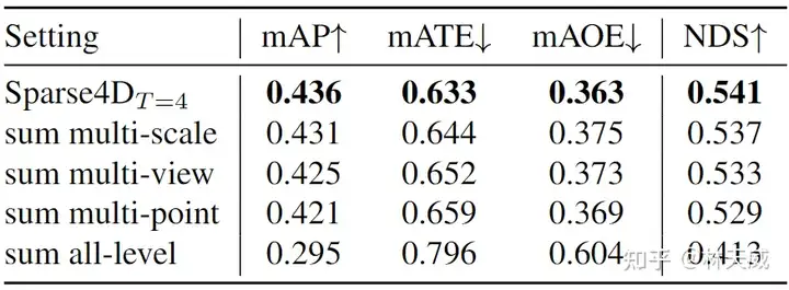多层次特征融合:在deformable aggregation中,我们需要对多尺度、多视角和多关键点的特征进行融合。为了分析各个层级融合的重要程度,我们分别将各层的加权方式改为直接求和,可以看到多尺度的影响小于多视角,而多关键点的融合最为重要。此外,将三个层级的融合全部改为求和的形式,模型将难以收敛,指标也会显著降低。