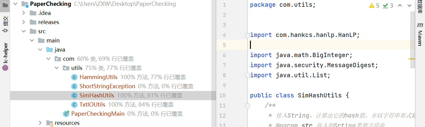 引用糊涂工具包的TokenizerEngine,通过hankc作分词处理,遍历词,构建词频树,最后计算查重率:cos值。