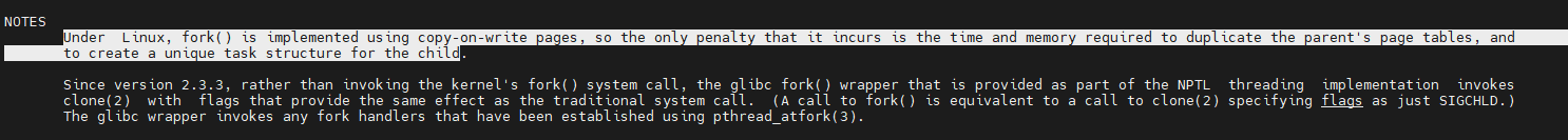 翻译:在Linux下,fork()是使用写时复制的页面实现的,所以它唯一的代价是复制父进程的页表以及为子进程创建独特的任务结构所需的时间和内存。