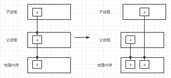 当没有发生写的时候,子进程和父进程指向地址是一样的,发生写的时候,就会拷贝出一块新的内存区域,实现父子进程隔离。