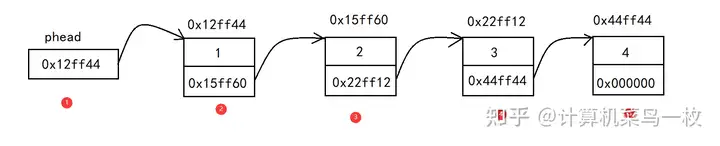 【2】组成:由一系列节点(Node)通过指针连接而成,从一个头节点(Head)开始,头节点作为链表的入口点,它包含了对第一个节点的引用。最后一个节点的指针指向一个空值(NULL),表示链表的结束。