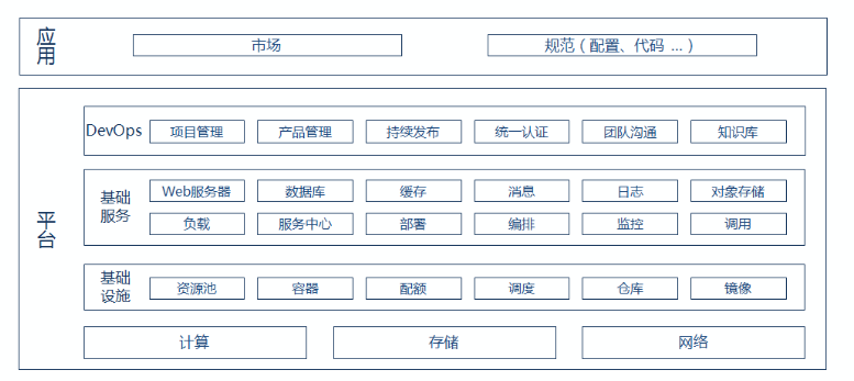 基础服务层:包括服务管理与调度的基础能力,如注册中心,编排,伸缩漂移;还有一堆具体的企业级或互联网式的云服务;
