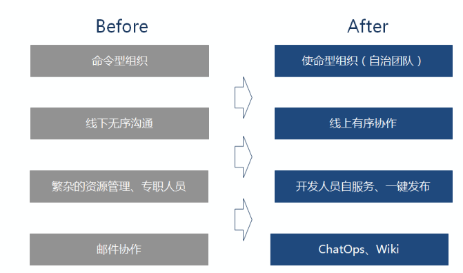 ? 从原来的邮件文化,到DevOps平台统一沟通,同时DevOps打通多个工具链路端,任务分发、沟通、提醒可以实时推送;