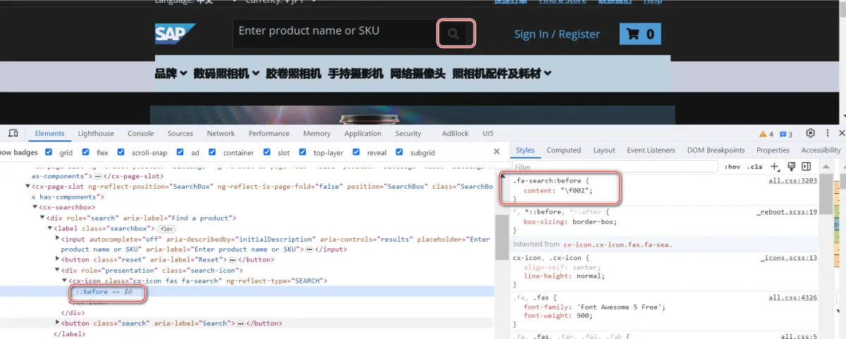 在Web前端开发中,上图提到的代码是属于使用字体图标(icon fonts)的一种方式。在这个特定的例子中,.fa-search 是一个CSS类,:before 是一个伪元素选择器,用于在匹配的元素前插入内容。而 content 属性的值 "\f002" 则表示要插入的内容是 Unicode 字符 \f002。