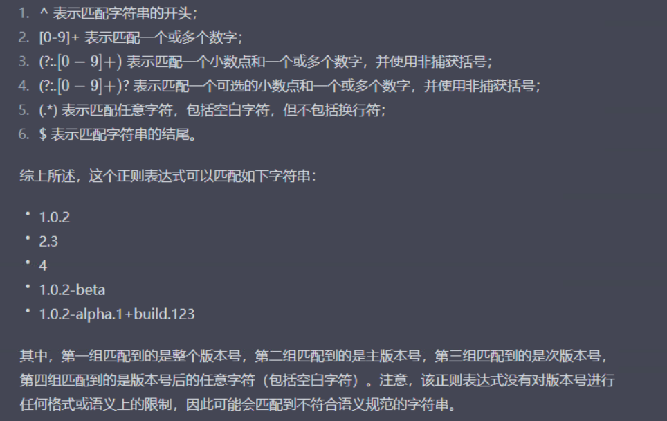 其中,第一组匹配到的是整个版本号,第二组匹配到的是主版本号,第三组匹配到的是次版本号,第四组匹配到的是版本号后的任意字符(包括空白字符)。注意,该正则表达式没有对版本号进行任何格式或语义上的限制,因此可能会匹配到不符合语义规范的字符串。