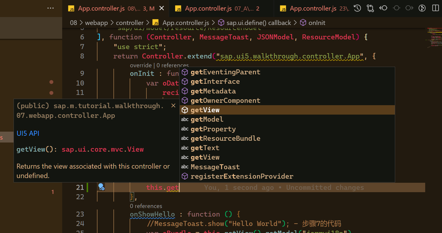 一个常见的场合就是,我们在 SAP UI5 应用的控制器里编写 JavaScript 代码,那么在这个上下文里,this 指向的就是控制器实例。如果 this 后面敲一个 . 号,能把这个控制器能调用的所有 SAP UI5 标准 API 自动带出来,并且附上每个 API 的参数说明和文档,那么能提高我们的开发效率和对 SAP UI5 API 的熟悉程度。