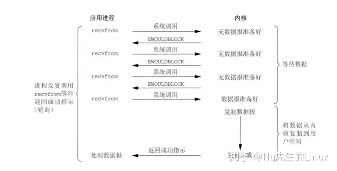 用户进程发起请求,如果数据没有准备好,那么立刻告知用户进程未准备好;此时用户进程可选择继续发起请求、或者先去做其他事情,稍后再回来继续发请求,直到被告知数据准备完毕,可以开始接收为止; 数据会由用户进程完成拷贝