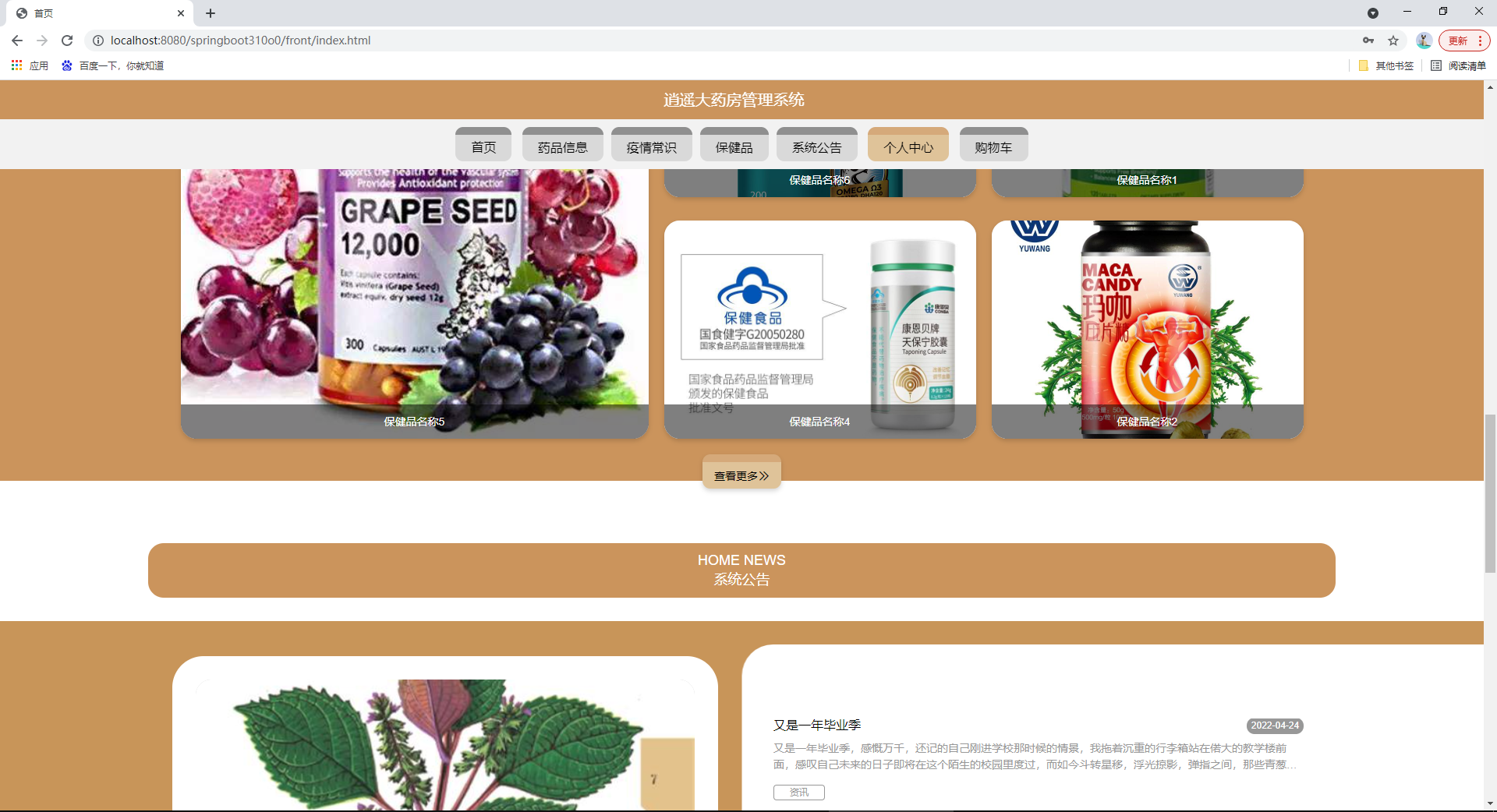该系统基于B/S即所谓浏览器/服务器模式,应用java技术,选择MySQL作为后台数据库。系统主要包括首页,个人中心,用户管理,保健品分类管理,药品分类管理,药品信息管理,疫情常识管理,保健品管理,系统管理,订单管理等功能模块。但是,这套系统实现的功能只是整个逍遥大药房管理系统中的一部分,系统中还存在一些不及之处,需要继续的创新,使其完美。