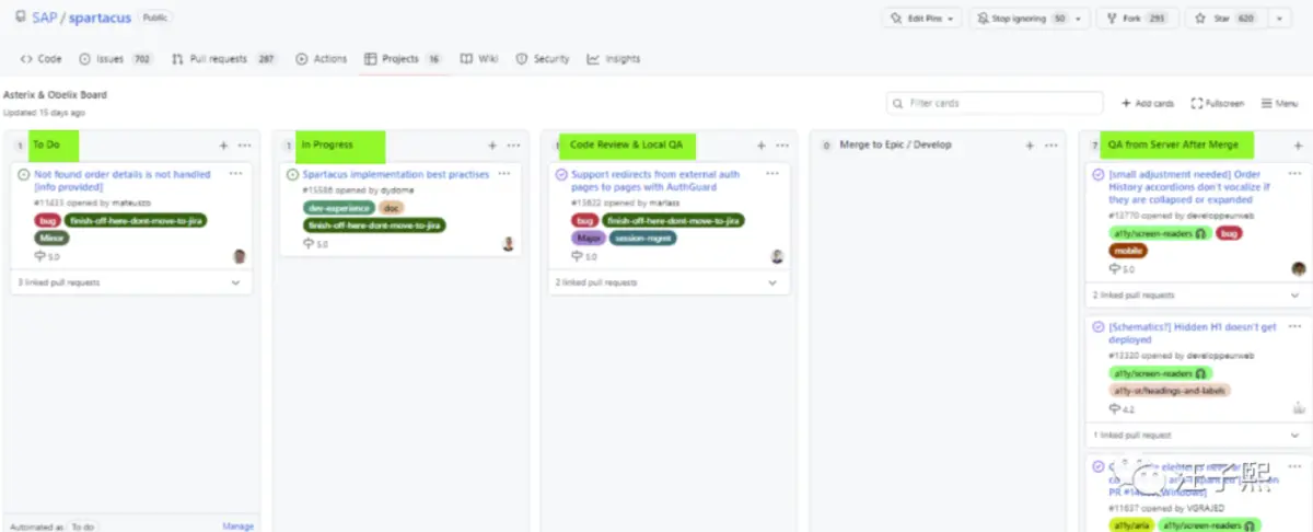 这些 Issue 可以分别被放置到名为 To Do,In Progress,Code Review & Local,QA from Server After Merge 的列之下。