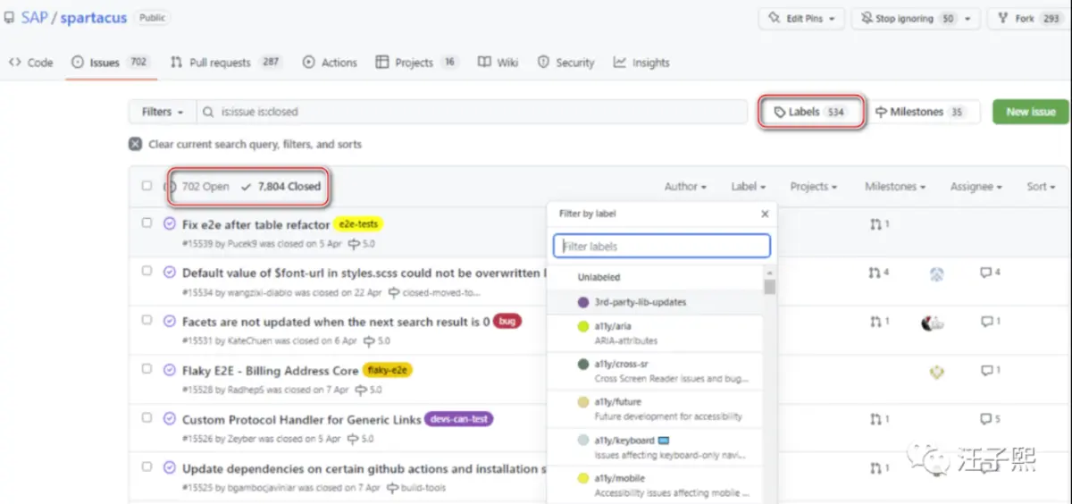 来自全球的 Spartacus 使用者和代码贡献者,可以按照事先准备好的模板,给我们的代码仓库创建 Issue. 这些 Issue 可以是现有功能 bug,也可以是新的功能请求。每个 Issue 可以分配一到多个标签(Label),用来标识该 Issue 的特征,以及需要解决的领域问题。目前我们的代码仓库有 7804 个已经关闭的 Issue,还有 702 个处于 Open 状态。这八千多个 Issue,通过总共 534 种不同类型的 Label 来描述。