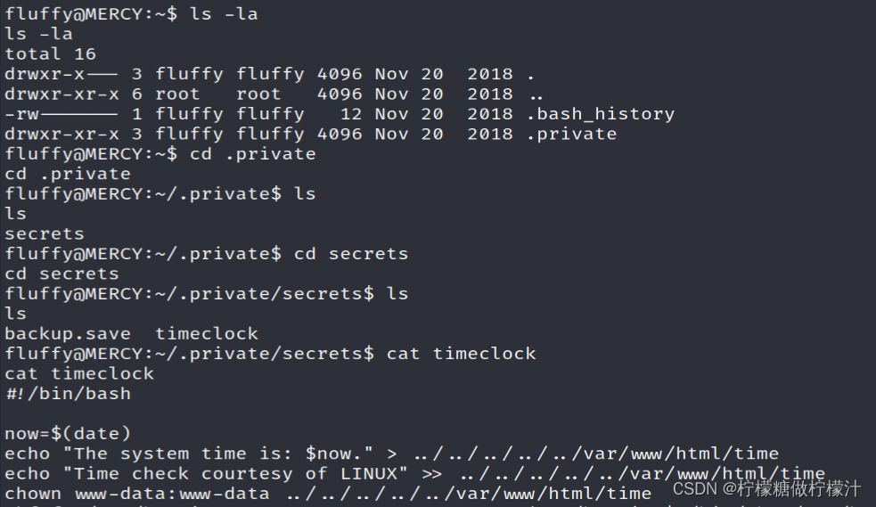 我们在fluffy用户中找到了一个记录时间的文件,根据观察,这好像是一个定时执行的脚本,但我们没有权限查看当前系统的计划任务。