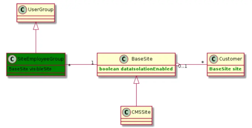 多站点支持使用基于现有 Customer 和 BaseSite 类型以及员工组的父用户组构建的数据模型。 客户和基本站点之间的关联被编码在新的装饰用户 ID 中。