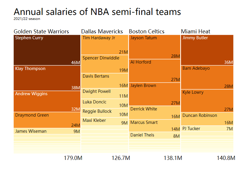 矩形树状图由多个类别组成,每个类别都有一个矩形。如果要处理数据中的子类别,则可以将这些类别细分为较小的矩形。矩形区域的大小传达值。因此,矩形树状图是快速查找类别内部和类别之间关系的非常有用的图表。另一个好处是有效利用空间,这使得同时显示大量数据变得容易。