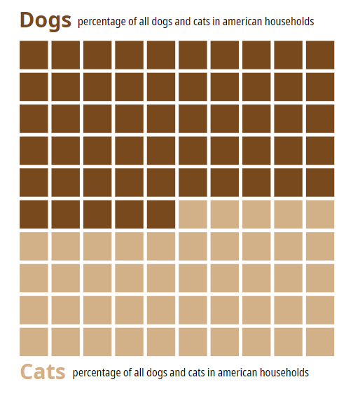 华夫饼图与图标数组非常相似。但是,它不是使用不同的图标,而是由 100 个方形(甚至圆形)单元格组成的网格组成。每个单元格代表 1%。此网格模式通常显示实现目标(或完成百分比)的进度,但也可用于显示部分到整体的贡献。华夫饼图通常被称为饼图的方形替代品,并且非常容易解释。它们看起来确实像华夫饼。