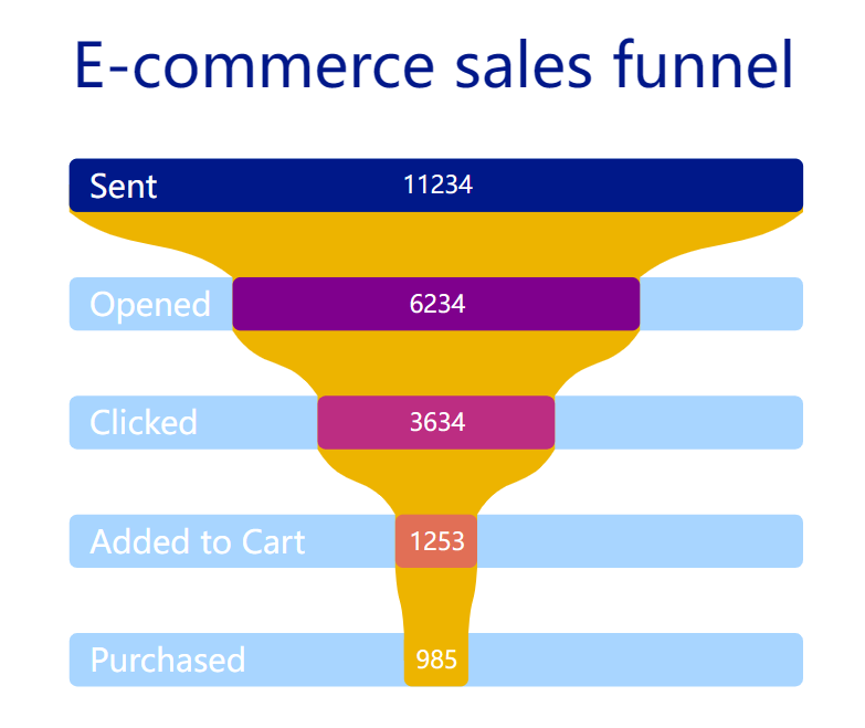 漏斗图是一种图形表示形式,可描绘连接的阶段和一系列数据值。在漏斗图中,因变量的值在流程的后续阶段会减小。漏斗图经常在演示文稿、报告、营销材料和仪表板中使用漏斗图来说明产品或服务的销售情况。每当需要显示随时间减少的数据时,都可以使用漏斗图。漏斗的每个部分都会显示总计的百分比,并且该值会随着向下移动而减小。所有部件加在一起的值应等于 100%。