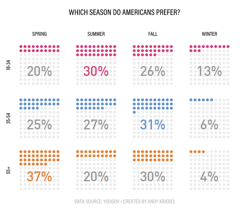 图标数组是清楚地可视化单位比例的图形。图标数组使用图标矩阵,通常为 100.这些图标中的每一个都代表某物(即人)的一个单位。然后将图标的一部分着色以表示我们数据中的数值。其余图标可能显示为灰色甚至不存在。图标数组是一种非常常见的图形类型,非常容易解释。