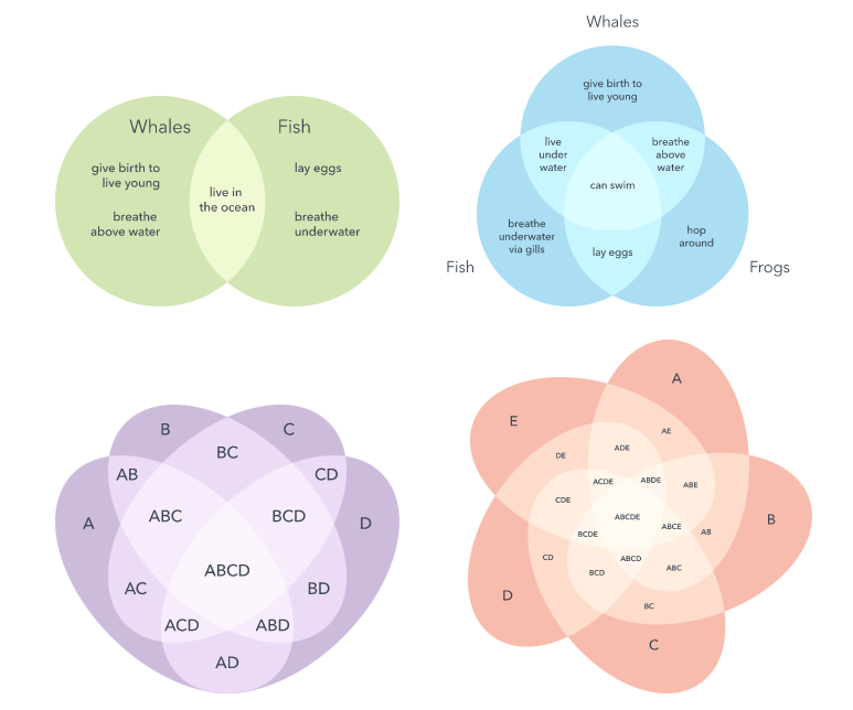 维恩图使用重叠的圆来说明两组或多组项目之间的逻辑关系。维恩图使用重叠的圆圈来说明概念、想法、类别或组之间的相似性、差异性和关系。组之间的相似性在圆圈的重叠部分表示,而差异在圆圈的非重叠部分表示。维恩图,也称为集合图或逻辑图,广泛用于数学、统计学、逻辑、教学、语言学、计算机科学和商业领域。