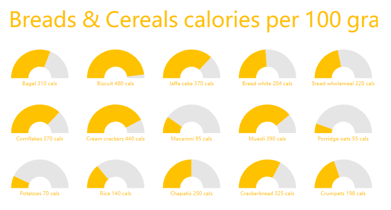 此图表的工作方式与普通饼图或圆环图相同,只是所有类别的总和会产生半个圆而不是一个完整的圆。它可以作为仪表图的基础,方法是使用切片显示进度或添加指针。
