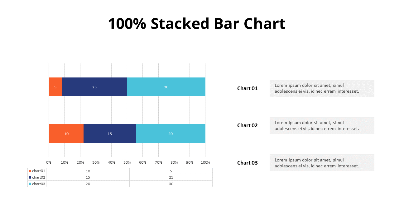 作为条形图(柱形图)的变体,堆积条形图/柱形图显示堆栈与整个条形或柱形之间的关系。整个条形/列也可以显示为 100%。在这种情况下,堆栈以百分比显示整个条形/列的相对部分。