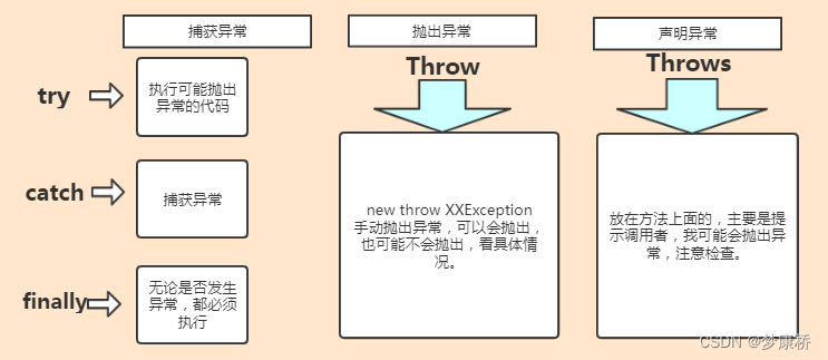 →异常被处理,程序继续运行 抛出异常→捕获异常→捕获失败(当 catch 的异常类型与抛出异