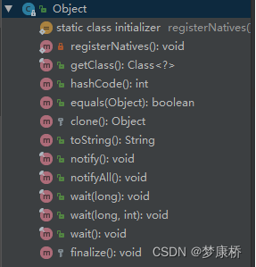 只要把上面几个方法熟悉就可以了,toString 和 getClass 方法可以不用去讨论它们。该题目考察的是对 Object 的熟悉程度,平时用的很多方法并没看其定义但是也在用,比如说:wait() 方法,equals() 方法等。