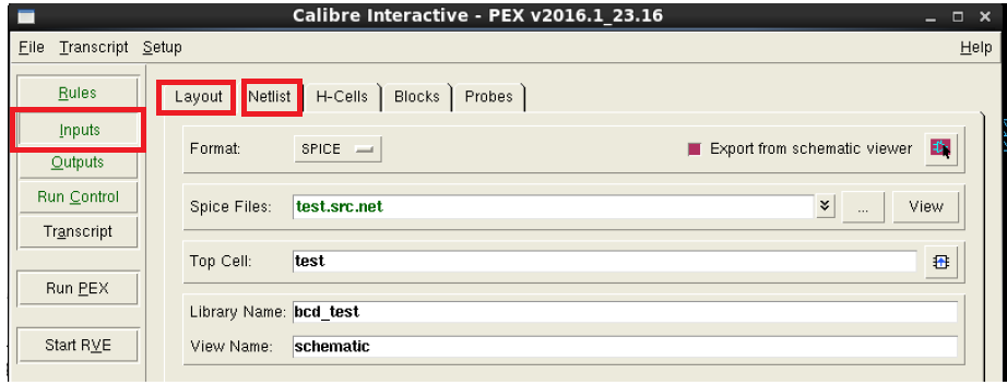 5.3在Inputs Tab, 选择GDS/CDL从版图/电路图直接抽取,指定好正确的版图/电路库名和CELL名称。如果数据没有更新,可以用原来的数据(和LVS设置类似);