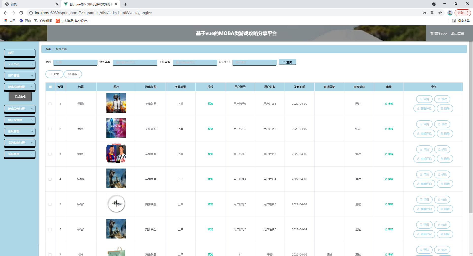 springboot基于vue的MOBA类游戏攻略分享平台、游戏资讯分享平台,附源码+数据库+lw文档+PPT,包运行,适合课程设计、毕业设计