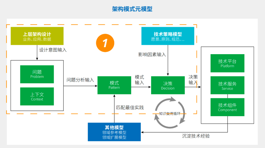 通常使用问题、上下文对上层设计意图进行系统性的分析后,得到的问题如果准确,那么它在业界往往已经存在成熟的解决方案模式可以参考。架构模式元模型的价值是帮助企业识别和利用已经成熟的最佳实践,提高架构设计质量,降低架构设计成本