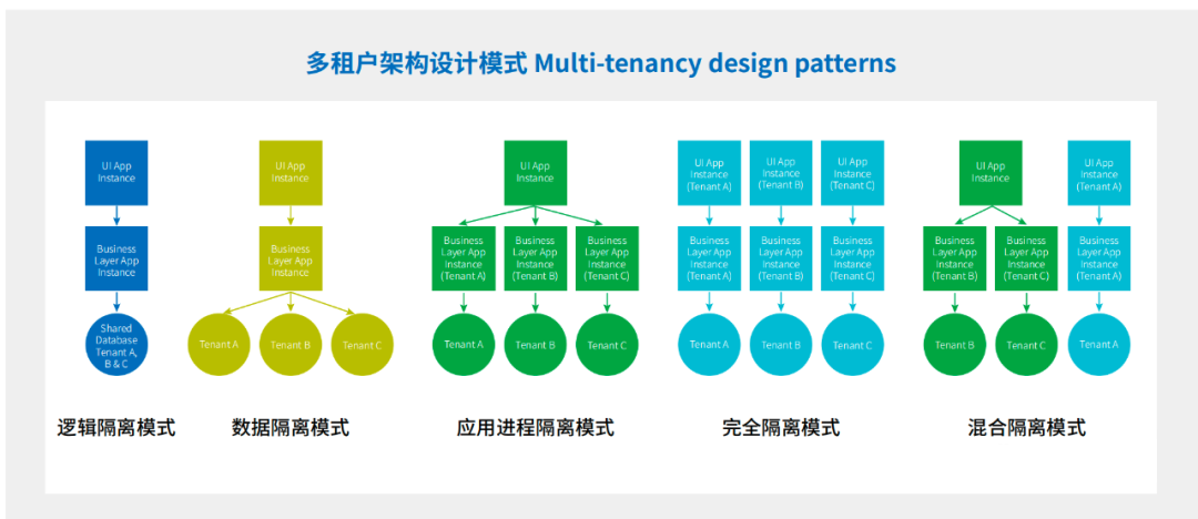我们以上面提到的中台如何提供一致的服务等级这个问题为例,经过分析,背后的技术问题定义是如何处理接入前台之间的跨功能需求 (安全、存储、性能、可靠性等)隔离问题,由此可以快速确定对应的基础架构是多租户(Multi-tenancy)架构。