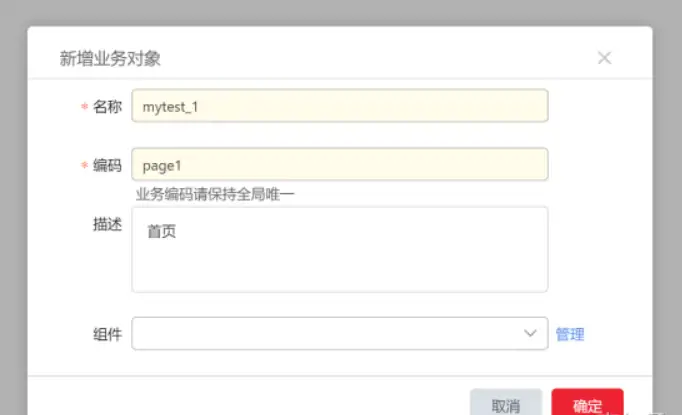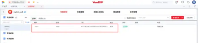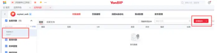 点击确定后我们看到已经有了【mytest_1】的这个业务对象,我们在这个对象中添加一个实体,也就是我们要发布的表信息的列设置。