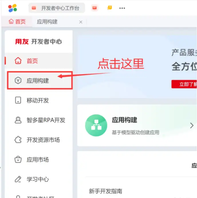 我们在首页左侧菜单中很明显的能看到【应用构建】四个大字,直接点就行。