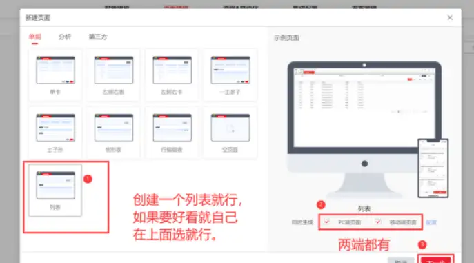 建模这里我们需要选择页面,不过我们就创建了一个实体,所以就选择列表吧,从示例页面中我们能看到可以同时生成PC与移动两个端的页面呢,点上后点击下一步。
