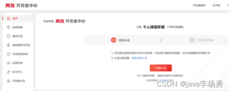 用友开发者中心实名认证前的效果: