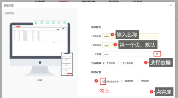 新建页面的最后一个步骤,需要输入页面的名称以及元数据,这个元可以理解成源,也就是我们创建的实体表。我们用普通发布就可以了,最后点击完成。