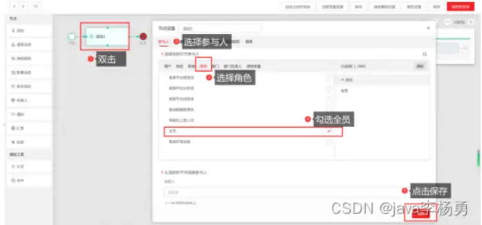 可以看到这个活动流程图,双击点开后我们在角色里面添加上【全员】,我们收集信息列表,故而是勾选全员。
