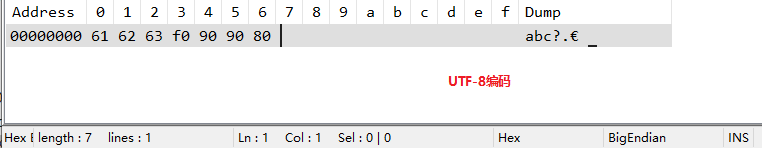 (3) UTF-8编码时: 7个编码单元,61, 62, 63, f0, 90, 90, 80