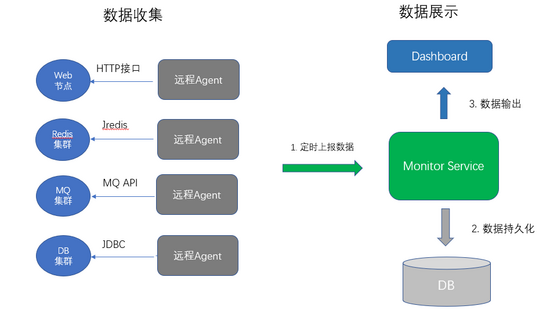 整个系统架构如上图所示,每个被监控节点,均有对应的 agent 负责采集健康数据,不同的节点类型,采集的方式不一样,web 节点提供 http 接口,agent 定时访问,Redis 和 MQ 通过对应的 api,db 则采用标准的 jdbc。除了 web 应用有少量改造(提供一个接口),其他节点都无需改造,系统的侵入性很低。