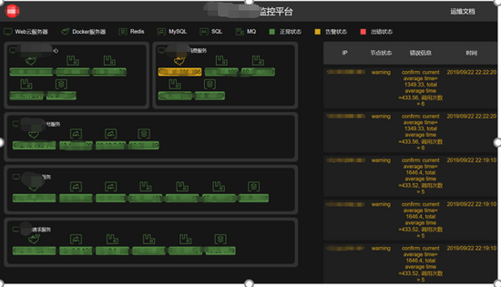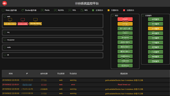 这是单个系统的监控,用一个单独的页面表示,如果一个公司有多达数十套系统,对应数十个页面,monitor 肯定看不过来,屏幕墙物理空间也有限。这里可以进一步做所有系统的大盘监控,每个系统在大盘上用一个方块表示,同样有红黄绿三种状态,这个状态是根据该系统内所有节点状态加权算出。