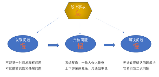 第三解决问题慢,当定位到问题,对系统进行调整后,验证问题是否解决也不是容易的事。更新大量机器需要时间,然后需要各个研发确认系统有没问题,还要通过滞后的业务曲线看业务是否恢复。有时病急乱投医,往往会发生二次事故,这里的问题是缺乏实时直观的反馈途径。