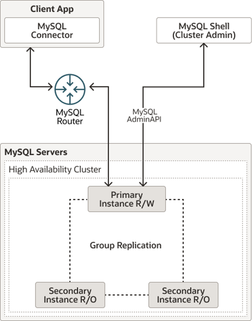 MySQL Router is part of InnoDB Cluster, and is lightweight middleware that provides transparent routing between your application and back-end MySQL Servers. It can be used for a wide variety of use cases, such as providing high availability and scalability by effectively routing database traffic to appropriate back-end MySQL Servers. The pluggable architecture also enables developers to extend MySQL Router for custom use cases. For additional details about how MySQL Router is part of InnoDB Cluster, see MySQL AdminAPI.