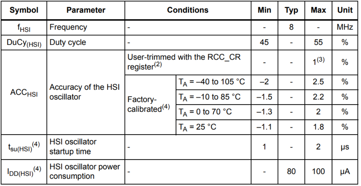 一般STM32的时钟源有两种主时钟方案,一个是依靠内部RC振荡器的HSI(内部高速时钟),另一个是HSE(外部高速时钟)。内部高速时钟源HSI,英文全称:HIGH-SPEED INTERNAL OSCILLATOR。一般情况下,内部HSI都会在ST出厂时已校准,但是精度不高,在0到70℃下误差范围可能达到-1.3%到2%,即便是在标准的25℃下,也有 -1.1%到1.8% 的误差(如下图)