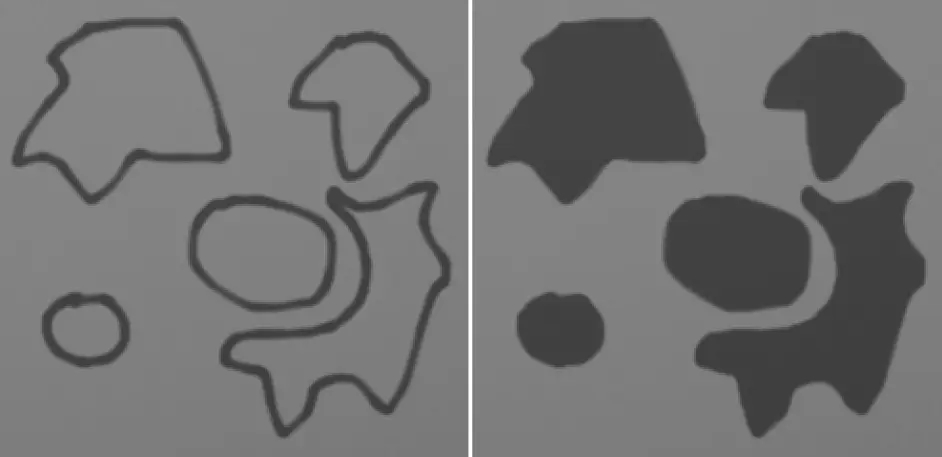 (左侧,应用了 alpha 蒙版,按下了分析区域并标记了部分;右侧,按下“填充区域”按钮后。)