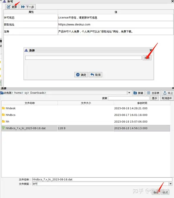 双击该图标,弹出许可框;按顺序点击更新——浏览,选择刚才下载的.dat文件,点击确定; 待弹出确认框后,点击下一步,即可使用HHDBCS。