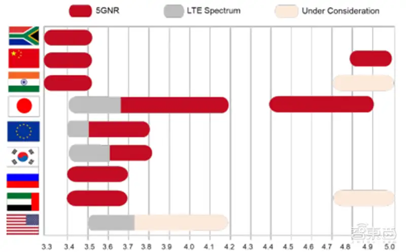▲世界各国在sub 6GHz频段分布