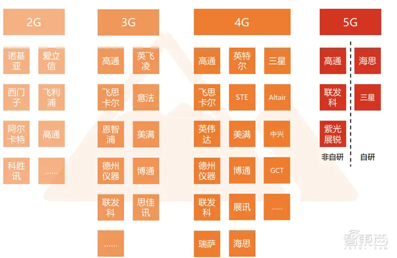智东西认为, 在经过1G-3G时代通信市场发展, 4G时代已有多家半导体、芯片厂商进入基带芯片市场。但由于高通在专利的积累、研发的优势,芯片厂商纷纷推出基带市场。目前只有高通、海思、紫光展锐、三星、联发科研发出了5G芯片 。现在,5G已经基本由高通、华为主导,华为既是芯片又是终端厂商,华为拥有商用先发优势;而高通拥有更大的生态优势。