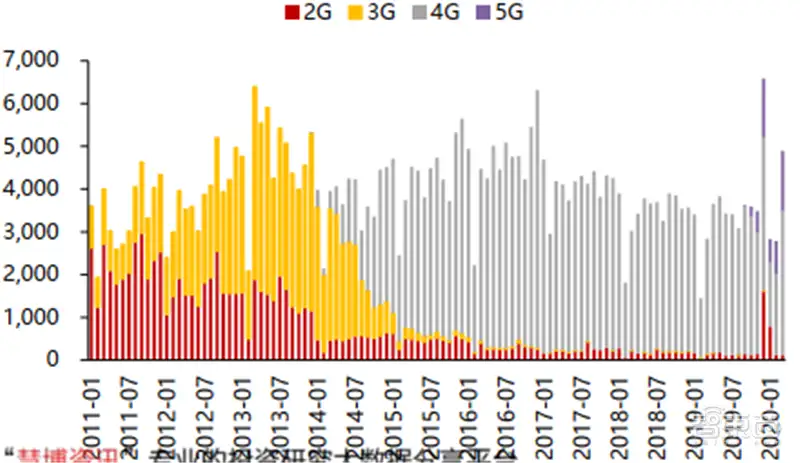 4G LTE基带出货量在2019年首次出现同比下降,主要原因是智能手机市场趋于饱和,基带出货量增长缺少动力。