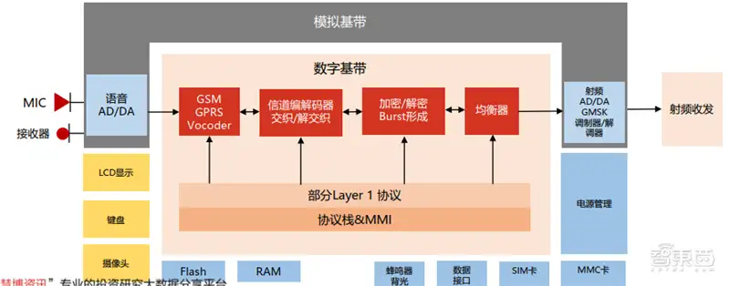 在每个移动通讯设备中都有一个基带芯片,它是一种用于无线电传输和接收数据的数字芯片。 基带芯片主要分为5个子模块: