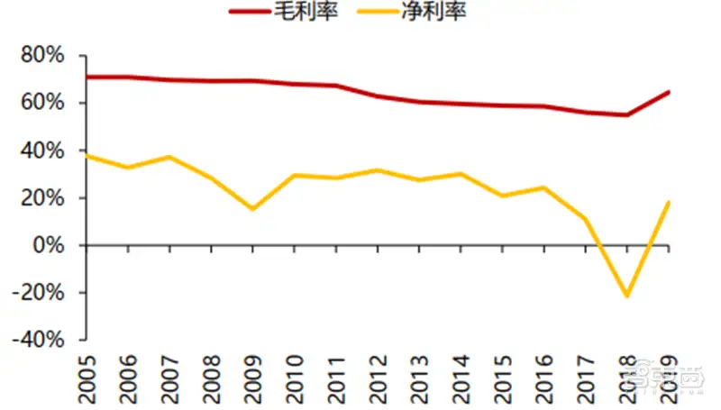 2019年毛、净利率回升主要是因为与苹果及其合同制造商达成和解,毛利率长期下降趋势主要由于全球手机需求持续疲软 。 高通毛利率从2005年起呈现平缓下降,从2015年71%下降至55%。除此之外高通和苹果关于专利纠纷以及美国对华为禁令都对高通的利润产生了重大影响。禁令后,中国厂商开始去美策略,华为手机销量提高,采用高通芯片的OVM厂商承受库存压力,同时华为专利授权收入将中断。